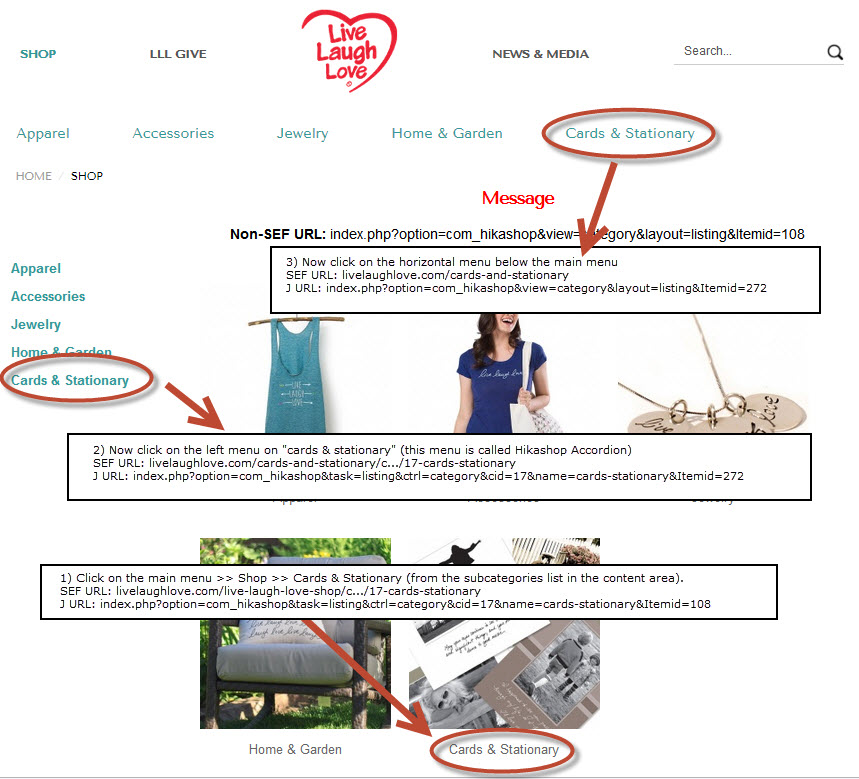 If I click on that menu I land in a page with subcategories. One of them is called "cards & Stationary" and the link from inside the hikashop navigation (by clicking on the category Icon) is: