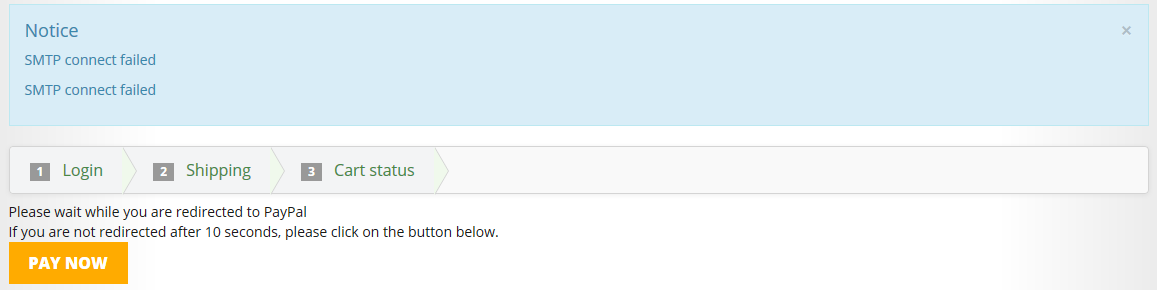 If I go to the end of the checkout process, when I am automatically redirected to PayPal I get a blue box that appears twice that says "SMTP connect failed". Here is a screenshot of the error message: