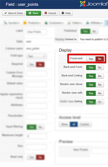 Second point, not linked to your issue, is your user custom field in Display option is switch Front-end to No, in order to avoid that your customer can edit his own points.