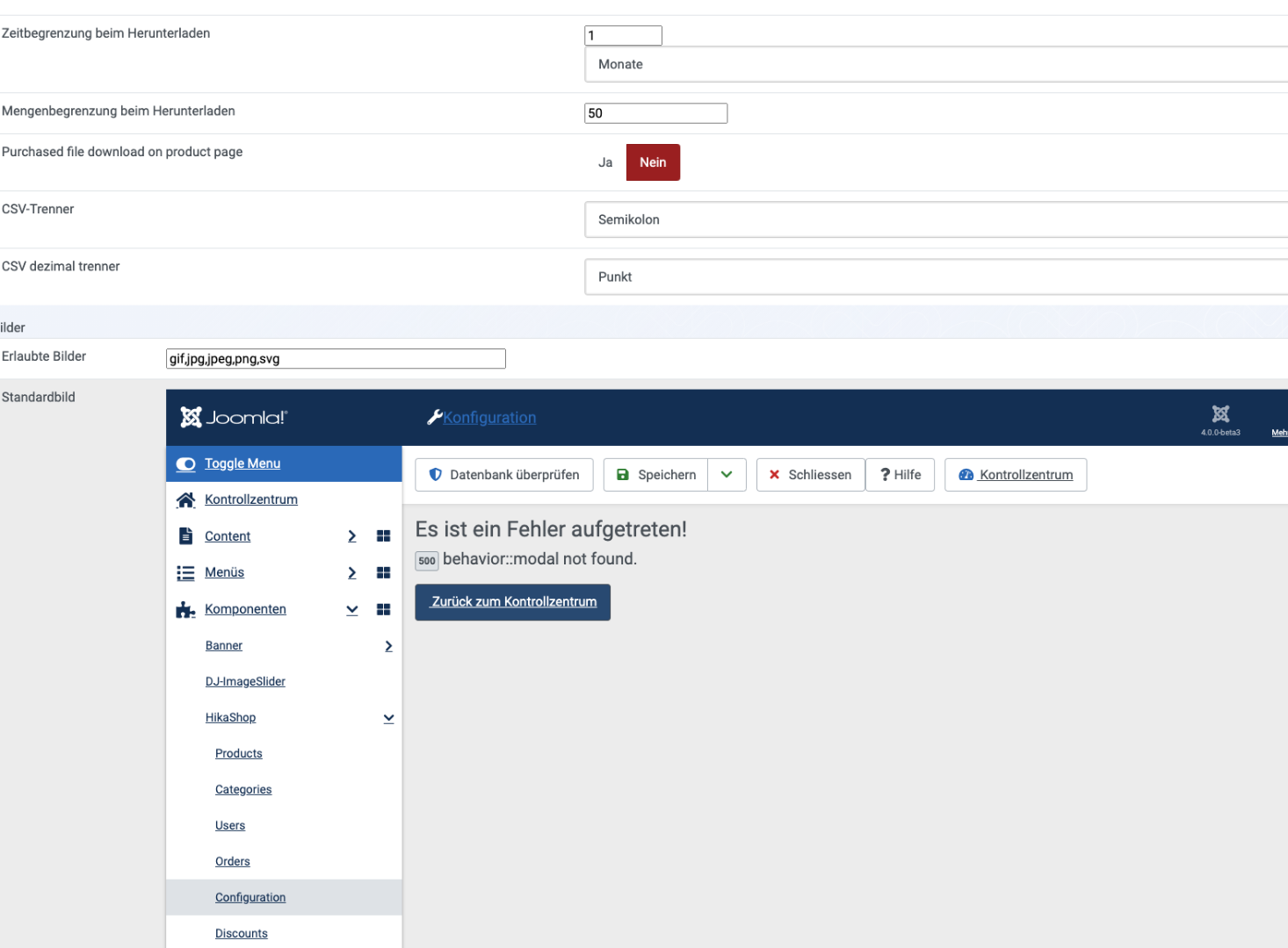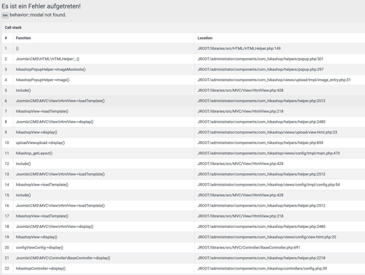 reading the error message I changed the popup.php (administrator/components/com_hikashop/helpers/popup.php on line 296 from
