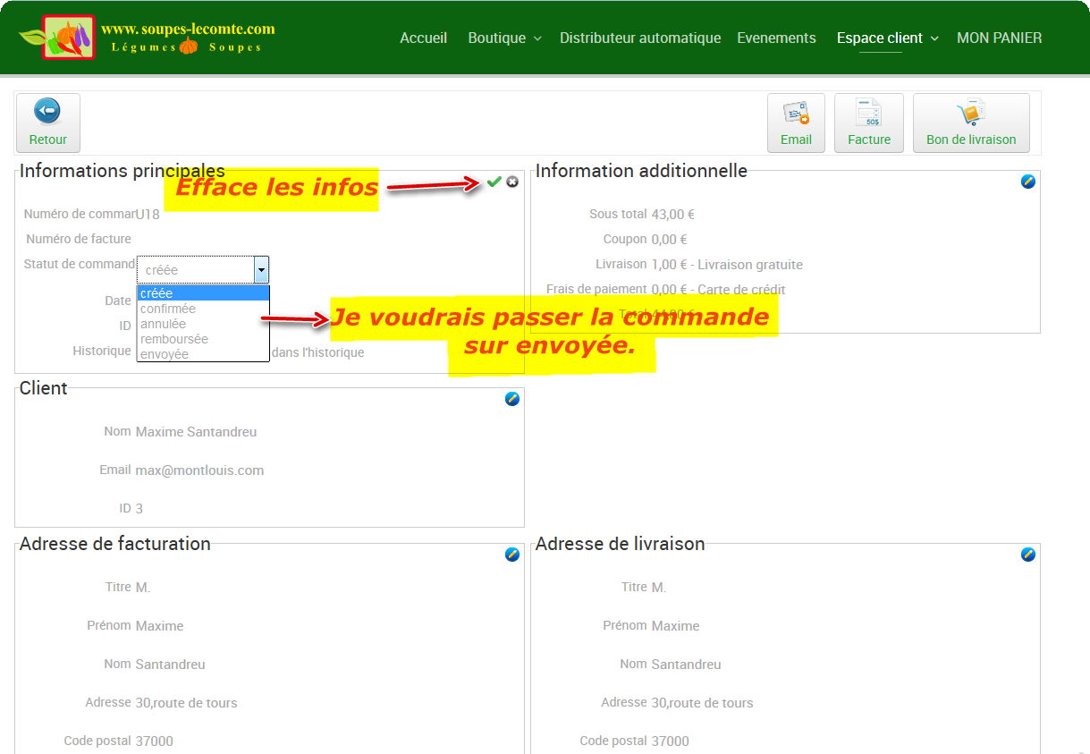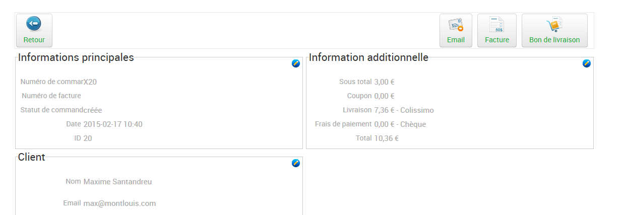 Lorsque je souhaite envoyer un émail à un client pour confirmer l'expédition de sa commande,je me connecte sur ma gestion de boutique , je clique sur commandes, puis sur la commande en question. Là j'ai les trois boutons (émail, facture, bon de livraison.) Si je clique sur émail, j'ai le popup qui s'ouvre avec un bouton "envoyer un émail". Si je clique sur ce bouton, le popup se ferme et aucun émail n'est reçu par le client.