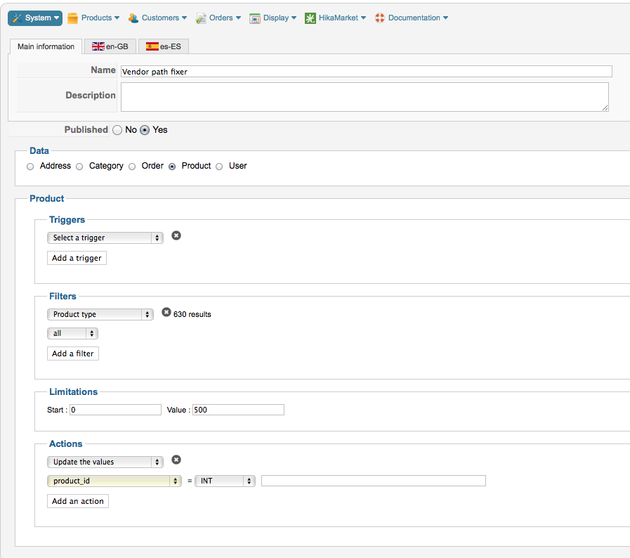 - Edit the HikaMarket "product" controller to replace the block