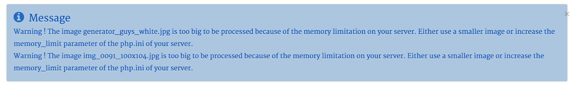 $app->enqueueMessage(JText::sprintf('WARNING_IMAGE_TOO_BIG_FOR_MEMORY', $filename) . ' [' . $estimation . ' / ' . $rest . ']');It should display the memory estimation and the free memory.