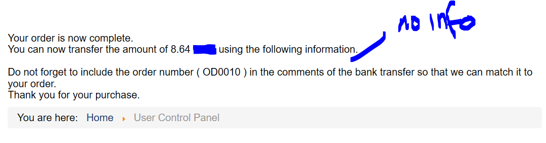 Can you check for frontend Payment of orders not paid immediately for bank transfer, the bank info missing.