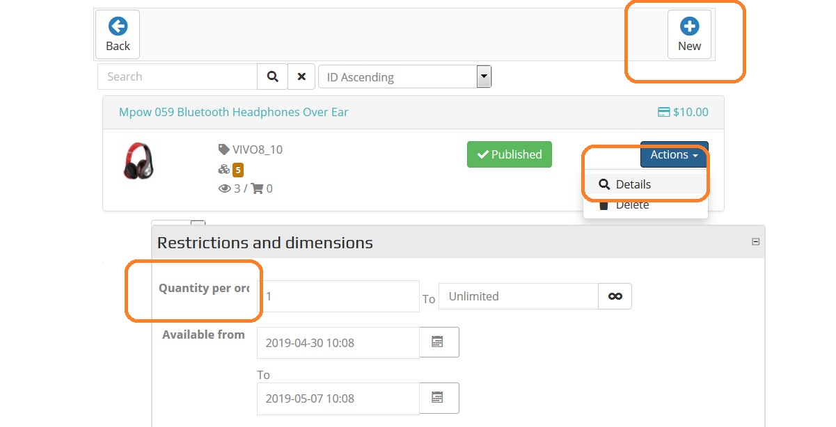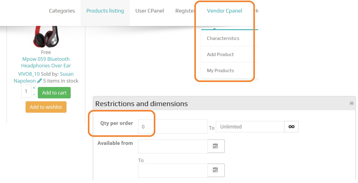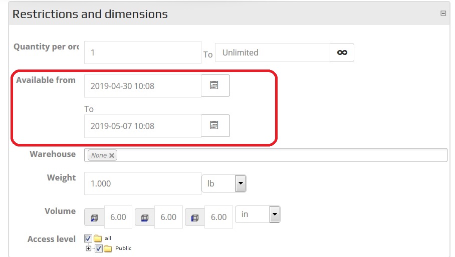 Note here the same section of restrictions and dimensions different spelling (Qty), as I previously changed it in Language file.