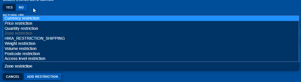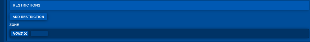 Clicking the button "Add restriction" -> Select "Zone restriction" -> Clicking the button "Add restriction"