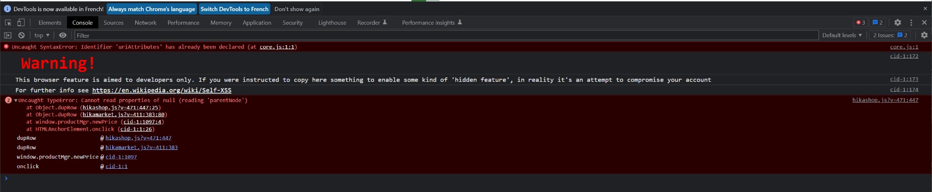 L'erreur JavaScript indique que lorsque vous avez cliqué sur le bouton "+", il a essayé d'ajouter du code HTML dans un élément HTML mais celui-ci ne semble pas trouvé (l'objet et "null" et l'erreur arrivé quand on essaie de récupérer son parent)