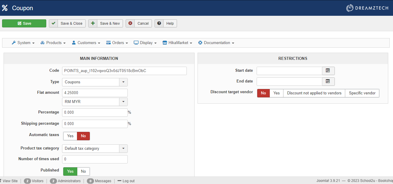 When you want to have a discount or a coupon which will be applied to vendors, you need to configure it via the HikaShop backend.
