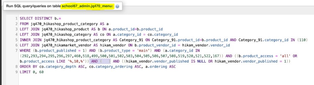 You have an error in your SQL syntax; check the manual that corresponds to your MySQL server version for the right syntax to use near ') AND ((hikam_vendor.vendor_published IS NULL OR hikam_vendor.vendor_published =' at line 1