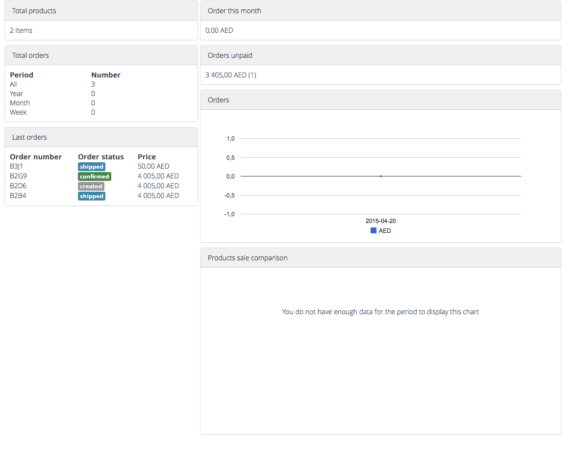 I seem to be having the same problem that Konstantin1996 has or had. The Total products, total orders, average order price, and last orders seem to be working fine. The Orders this month, Orders Graph and Products Sale Comparison Graph show no activity.