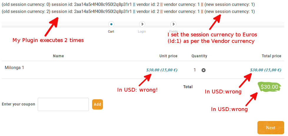 At the begining of the plugin the session currency has no value or value 2 (USD), and at the end of the plugin I set it to the Vendor currency Euros (id:1).