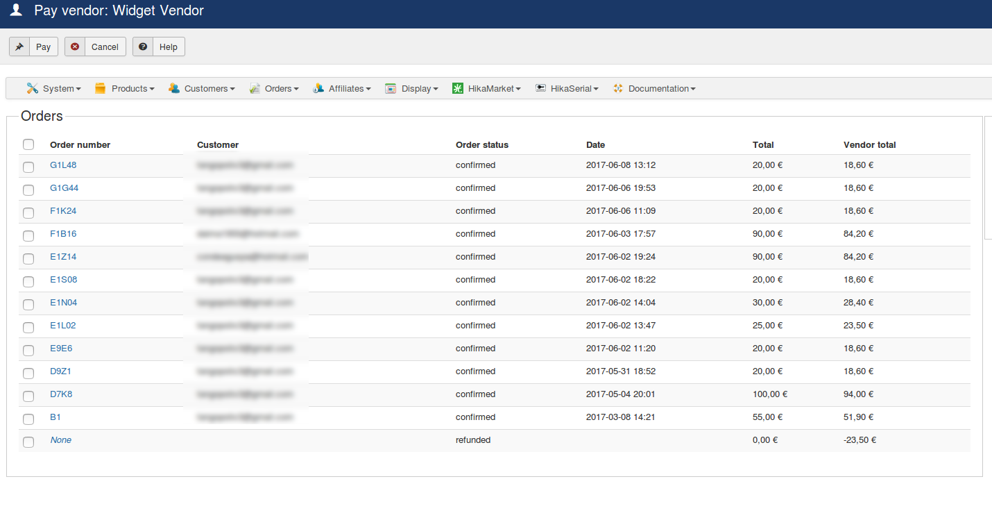 Step 4. The Vendor pays 23.5 Euros back to the Store and the Site Admin changes order H1N73 to confirmed