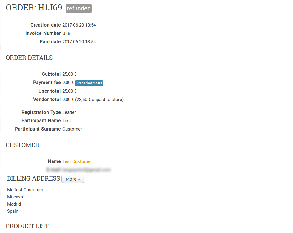 • This creates a new order H1N73 in status created for the account who is admin of the Vendor Account for 23.5 Euros → screenshot7