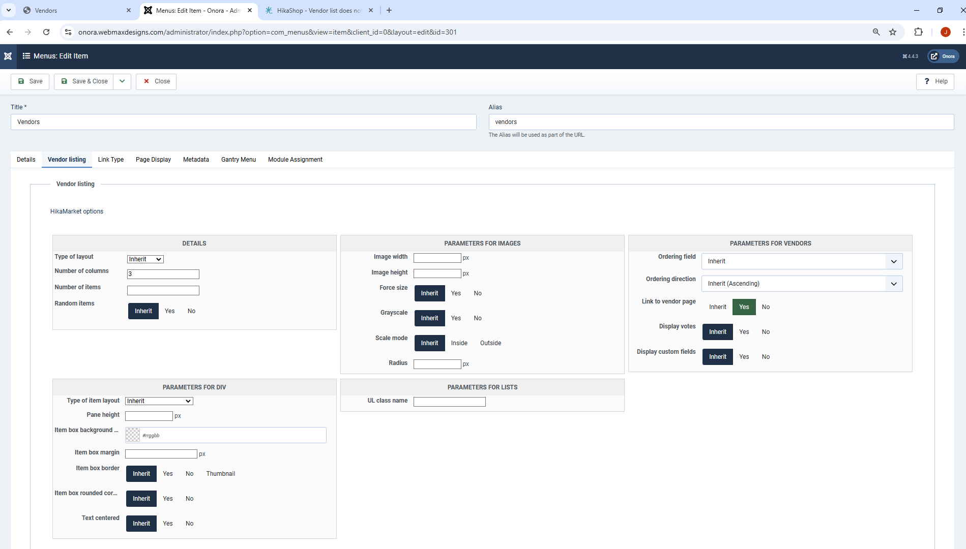 Also, please select a value for "Type of Layout" and "Type of Item Layout" instead of "inherit" ; HikaMarket 4.1.1 could have an issue with HikaShop 5 for such setting.