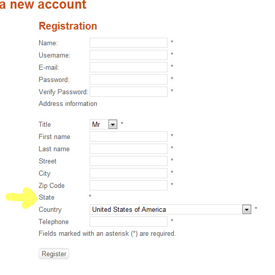 Apparently, Ukraine has no values for state. But since it's a required field, any buyers from Ukraine would not be able to continue with registration. I haven't tried every country. But, Ukraine is not showing any values for state. I don't think they have any states, but they have regions. Only workaround would be to make the 'state' field 'not' required.