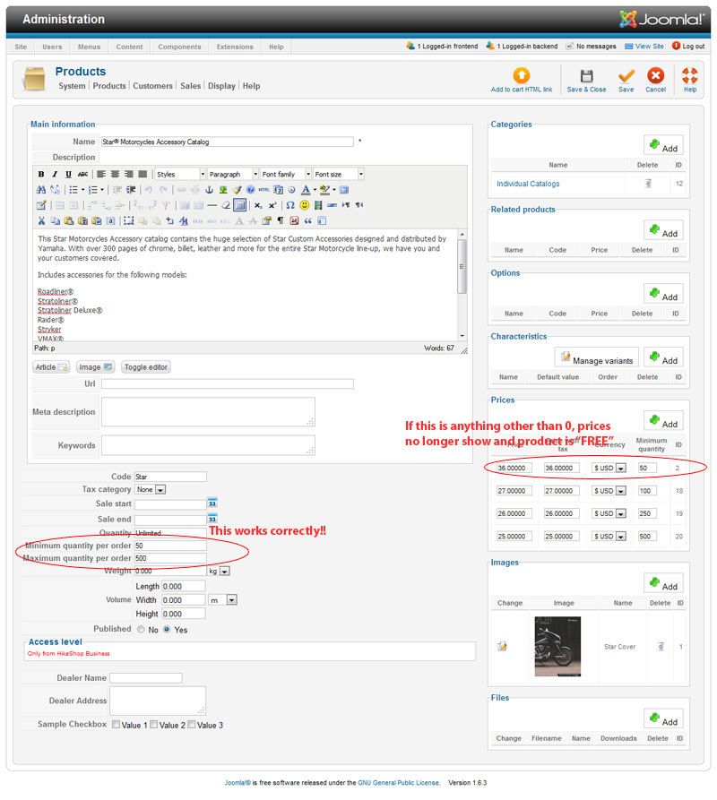 Also note, that setting the first price break to anything but 0 also removed all prices display from all admin screens as the other prices are ignored and product is considered free.