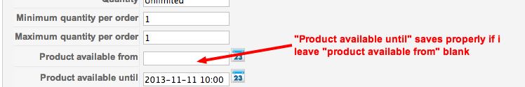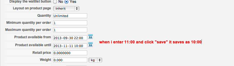 To be perfectly specific, the timezone is properly set for your PHP scripts, and I don't see any PHP setting on the server that can convert this way the data you submit. For me personally, this is an issue with the component, and a confirmation for this is that if you leave the field Product available from blank, the submitted data is saved properly. If it was an issue caused by server-side setting both fields would have been affected, regardless if one of them is blank, as they both relate to timestamp value.