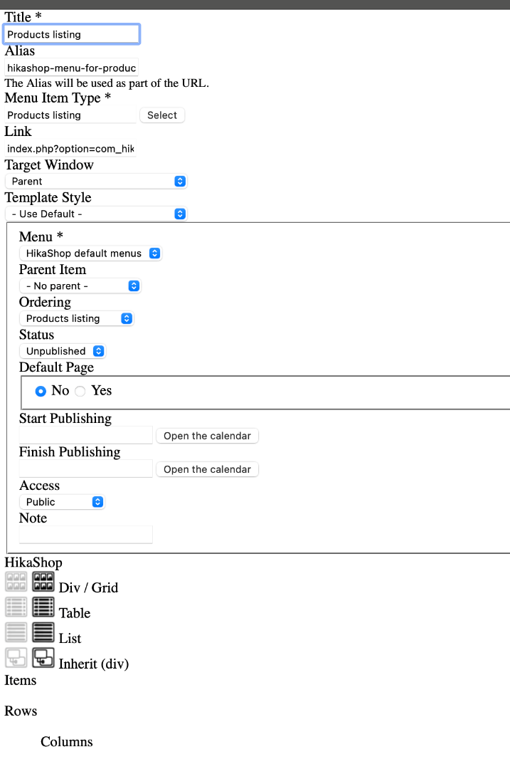 I am using the latest version of Hickashop business and this is on the backend. I can therefore not create menu items for the frontend or edit current menu items.