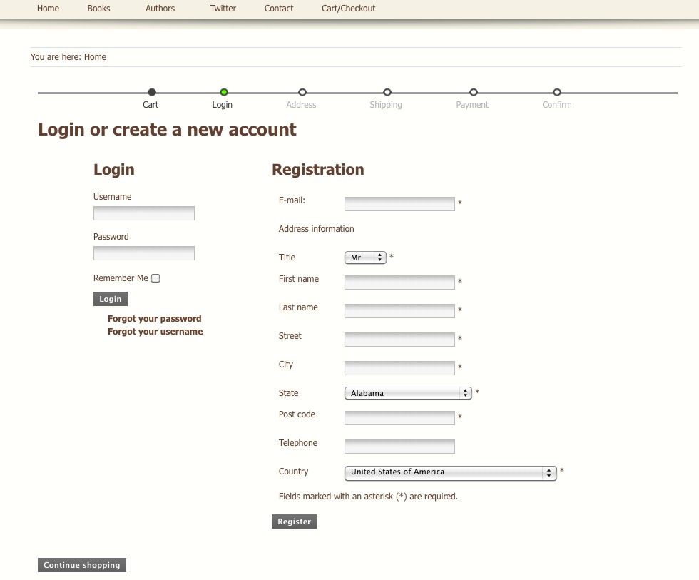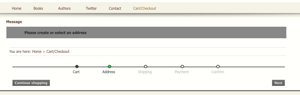 The problem arises IF I cancel the order at PayPal and return to my site to start over. When I add a product to the cart and select "Next" the system tells me to select an address, but there is no way to select the address I first created and no way to create a new address.