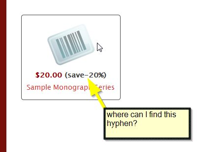 Second, I created a discount for my products but I don't like the wording of the discount per product. I found the appropriate language file but I would like to get rid of the hyphen (or minus sign), which does not appear to be in the language file. I prefer to hack the core to avoid problems when upgrading.