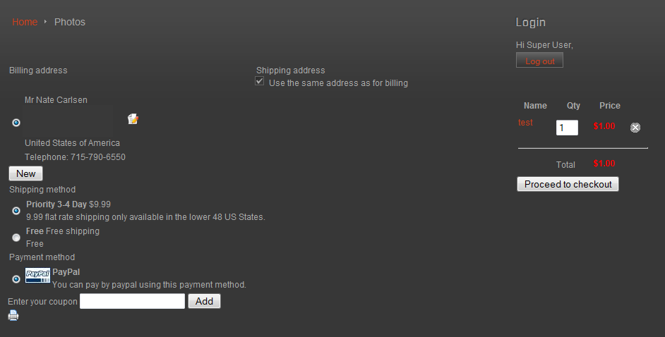 Your paypal payment plugin is not configured properly. It disappears from the checkout once an address is entered. So I'm not able to test anything. You should check on that FAQ www.hikashop.com/support/documentation/i...ins-listing.html#faq