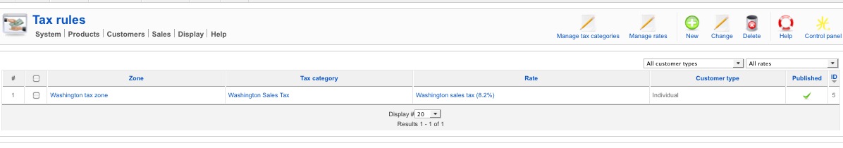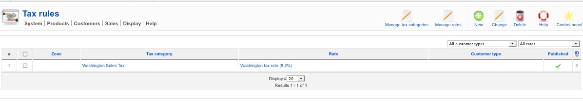 Then, go back to System->taxes and click on "new" to create a new tax rule. You will limit it to your state, select your tax category and your tax rate and save.