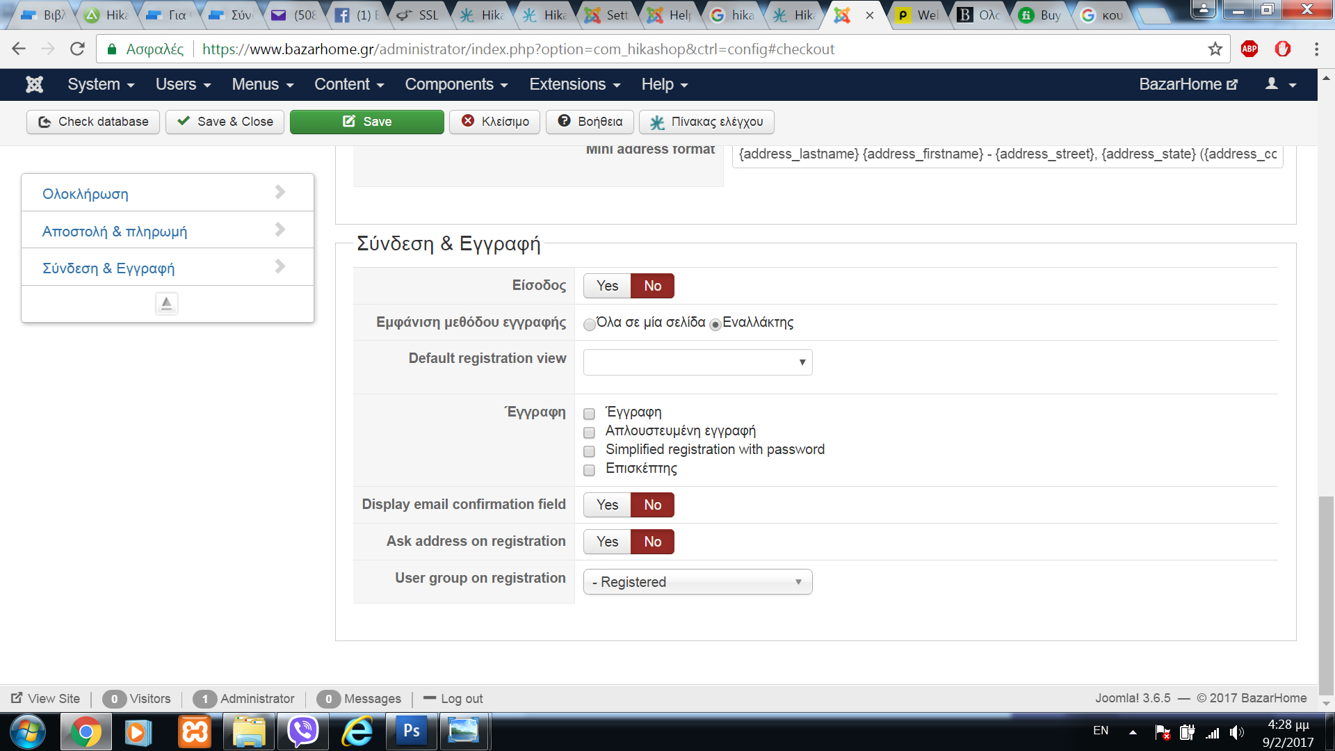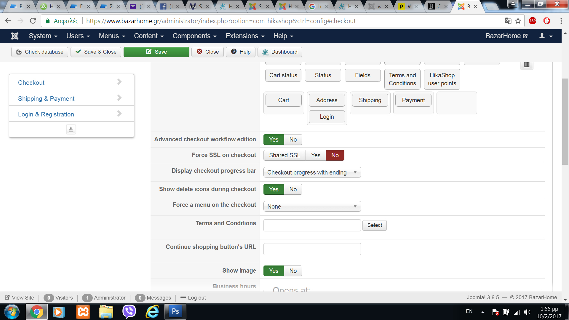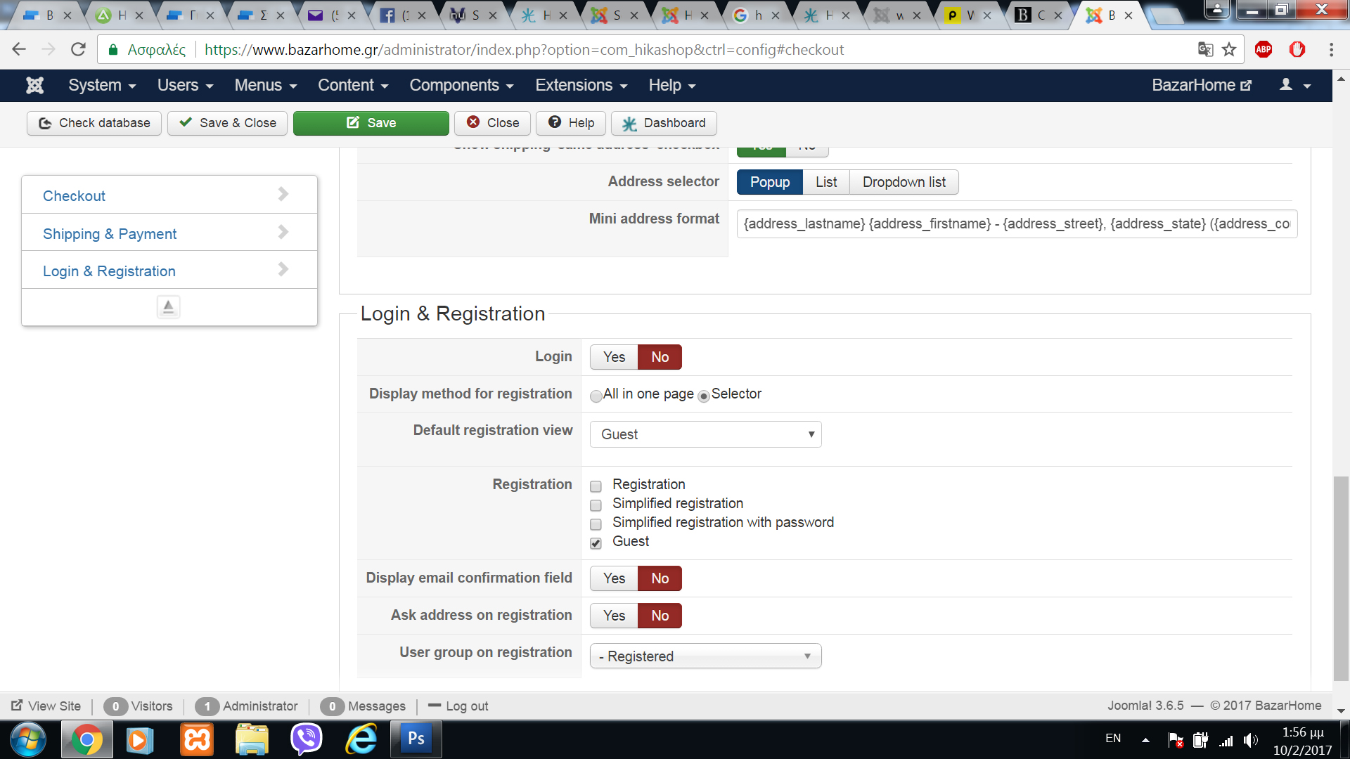 I have attached the issue and the configurations that i have right now. I think even though its not in english you will understand or else i will change language file and resent it. I would like in this step to remove registration and have only a form that customer will fill with his informations for purchase. But now in this step is only registration and nothing else from adress fields, phone, postal code e.t.c. Joomla version 3.6.5 HikaShop Business: 2.6.4 site url www.bazarhome.gr