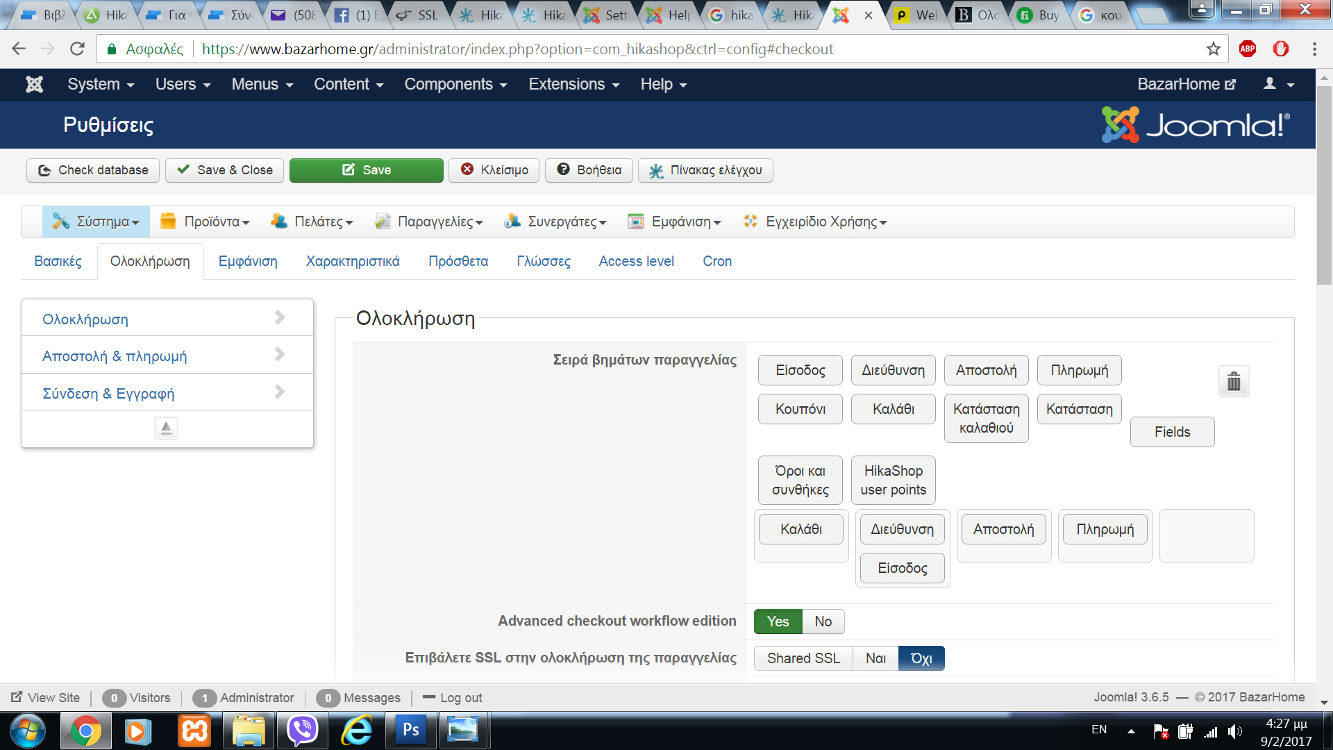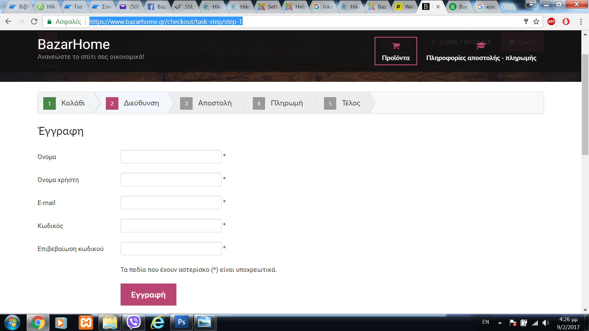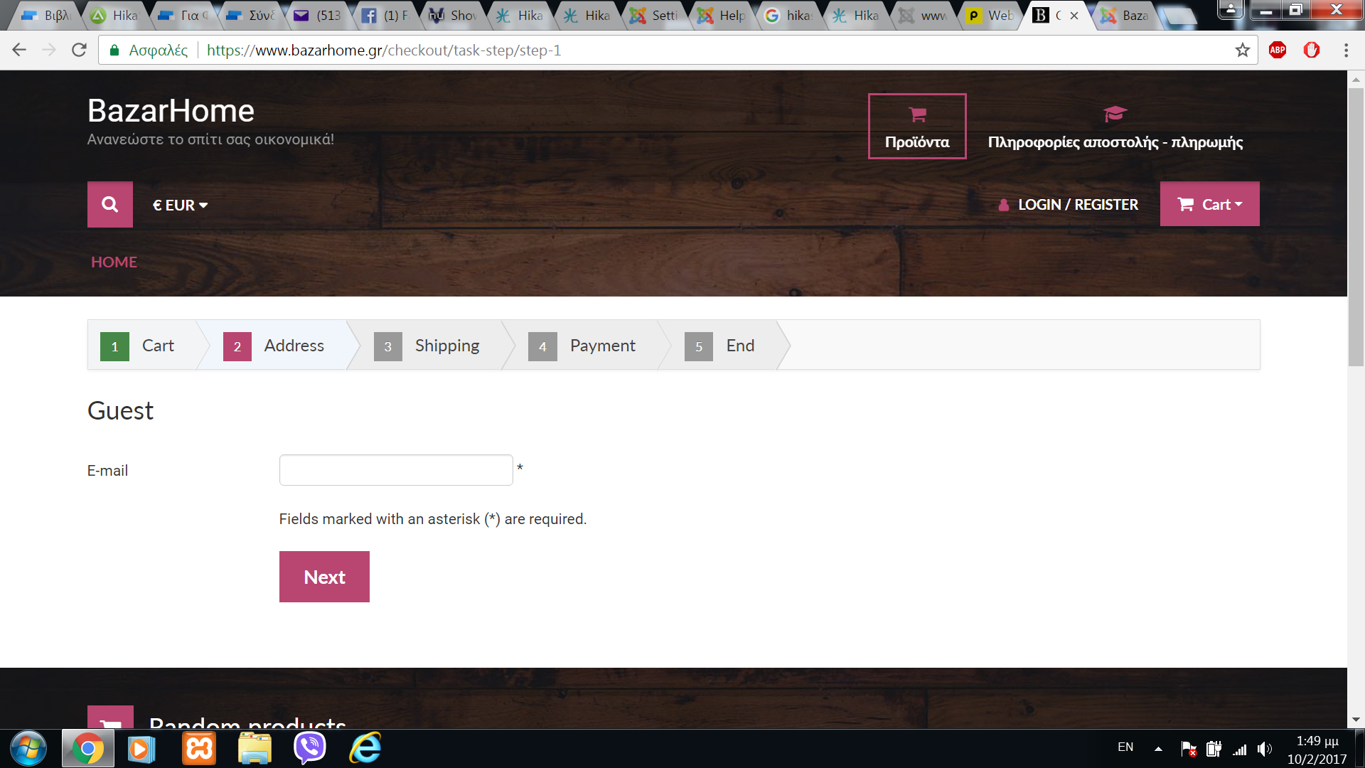 I have attached the issue and the configurations that i have right now. I think even though its not in english you will understand or else i will change language file and resent it. I would like in this step to remove registration and have only a form that customer will fill with his informations for purchase. But now in this step is only registration and nothing else from adress fields, phone, postal code e.t.c. Joomla version 3.6.5 HikaShop Business: 2.6.4 site url www.bazarhome.gr