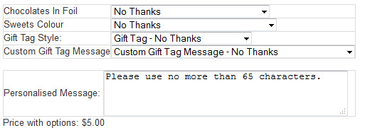 Chocolates (Multiple colour variations) if they select one, it adds $2.00 to the base cost