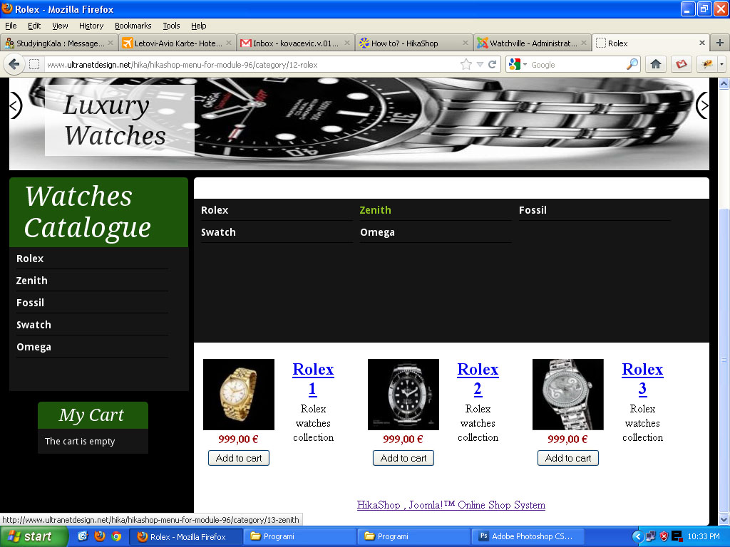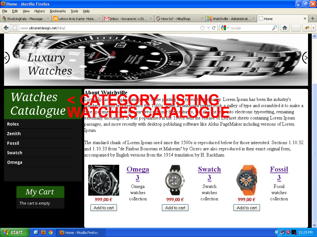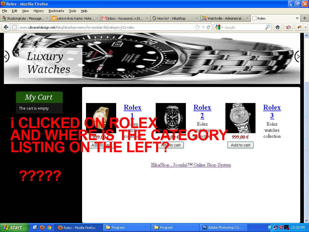 Hikashop cart module (my cart) is always there, but the category listing menu disappears. Just click on any of the categories in teh Watches Catalogue and you will it won't be there when it displays the products from that category.