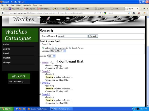 If I search for swatch in the search box, I get the products nicely, but I also get a 'product category' result, and if you click on it it links to a blank page.