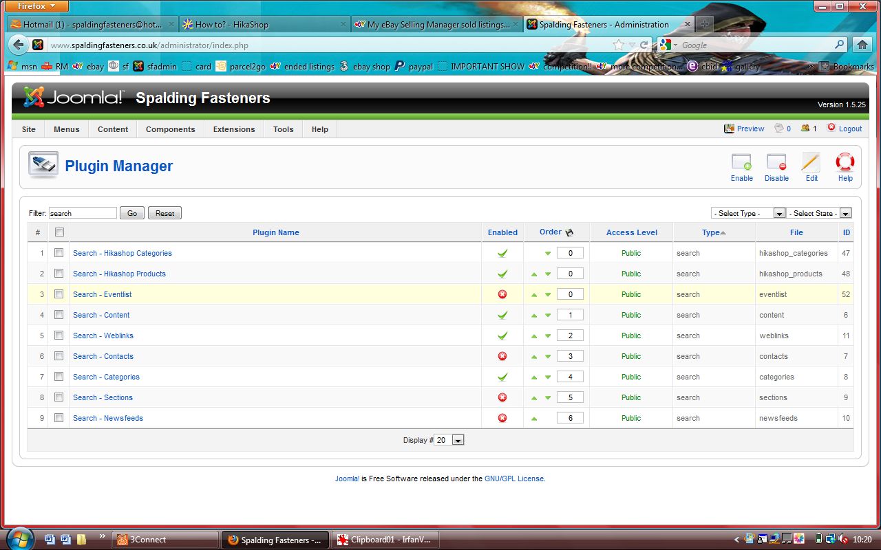 yes I think so. I have attached screen shots of both the module manager and plugin manager. I have also attached screen shot of the content menus screen - I have tried putting the ID of each of the content menus (25, 17, 7, and 2) into the item id box on the search plugin, but none of them work.