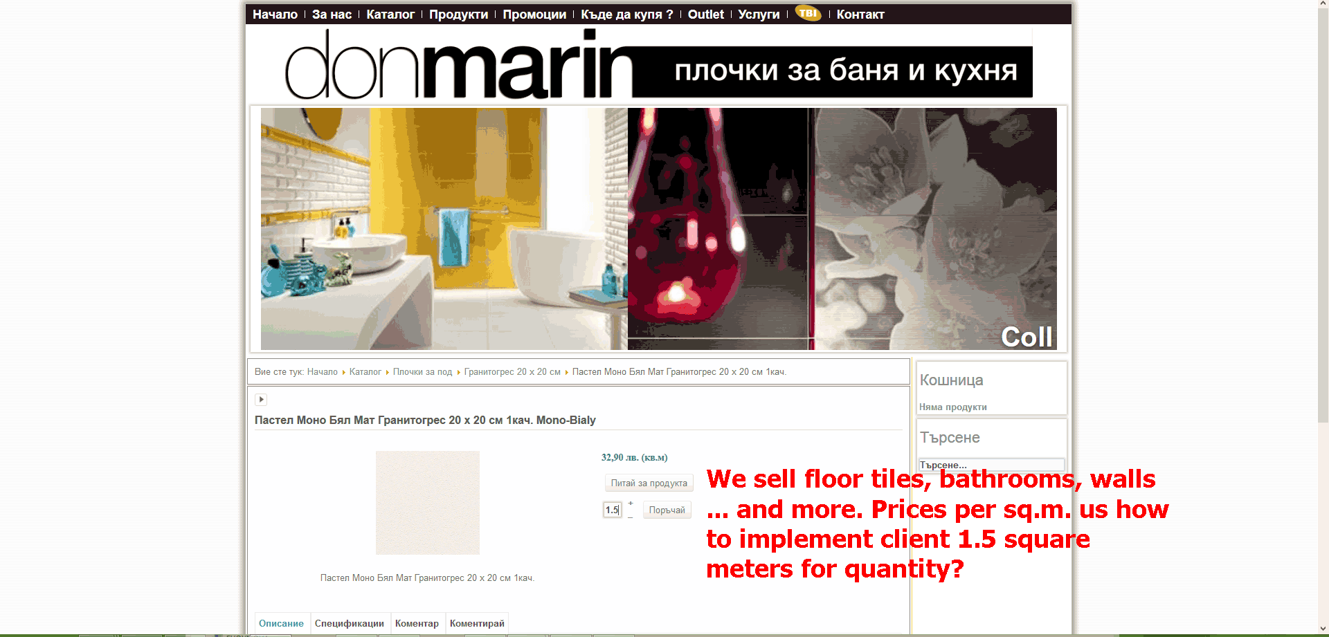 Hi Nicolas, We sell floor tiles, bathrooms, walls ... and more. Our prices per sq.m. ... how to our consumer imput 1.5 square meters for quantity field in the cart?