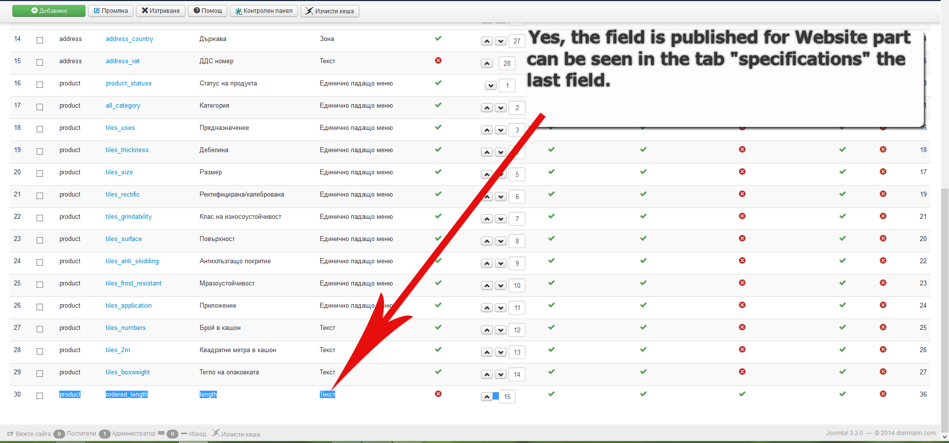 2. Create 2 custom fields from the "Item" table named "width" and "length" through "Hikashop->Display->Custom Fields->'New'" , and publish them for the front-end.