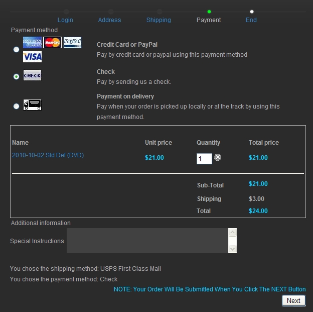 Step 2 shows the cart and the status along with the NOTE which I was able to nicely style and give a bit more info on the two payment options and what happens next