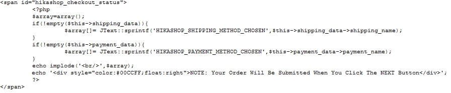 I couldn't get the "code" to work on this forum either so I just tried writing the code without any special forum formatting applied and it appeared without causing problems. The only problem I can find with your solution is that pressing the next button doesn't always submit the Order for me. I am using the default checkout workflow which is everything on one page so it would work except for the issue that I mentioned above with the multiple Addresses and having to press the next button to refresh the page. At least I have something to work with now. Thanks Ed and Nicolas.