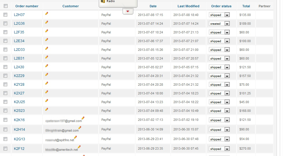 See the attached screen shot, you'll see email addresses at the bottom but orders since then are blank in the customer field.
