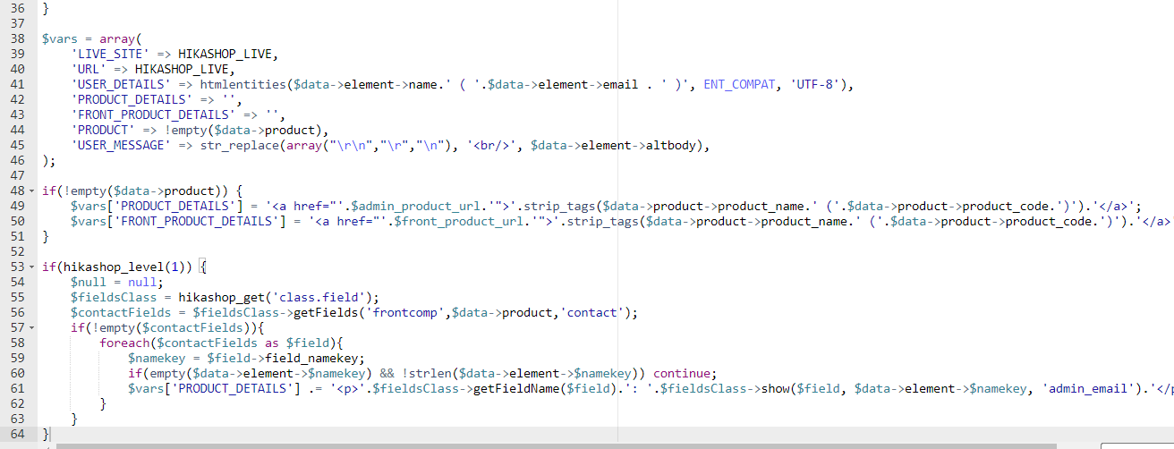 $vars['PRODUCT_DETAILS'] .= '<p>'.$fieldsClass->getFieldName($field).': '.$fieldsClass->show($field, $data->element->$namekey, 'admin_email').'</p>';