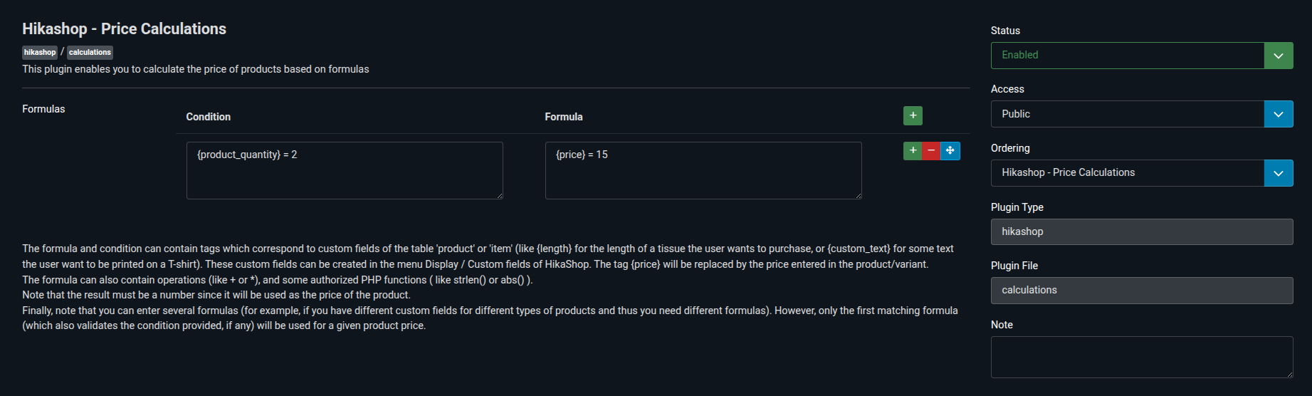 Very new to the backend part of all this. The product is priced by quantity ordered: 1 for $9, 2 for $15, 3 for $21. I have installed the Price Calculation plugin, but can't figure out how to write the necessary formulas. This is what I have so far, but it's not working: