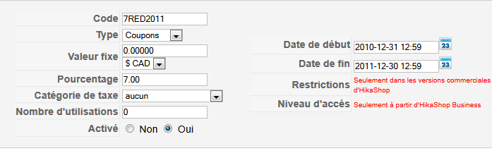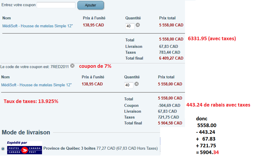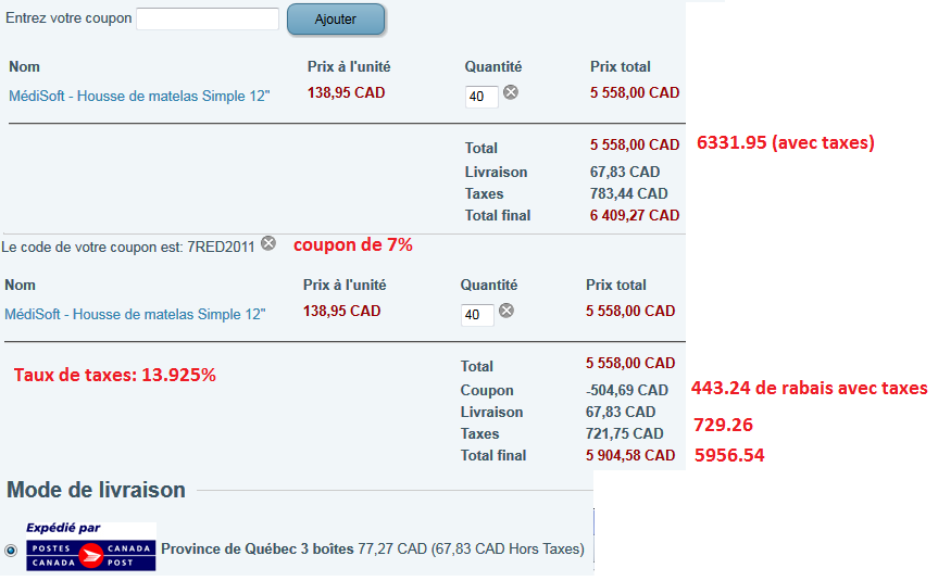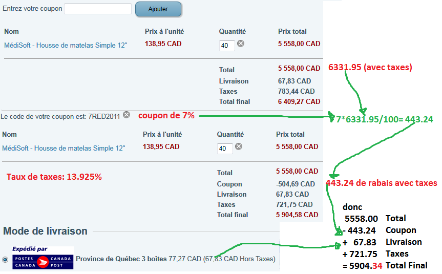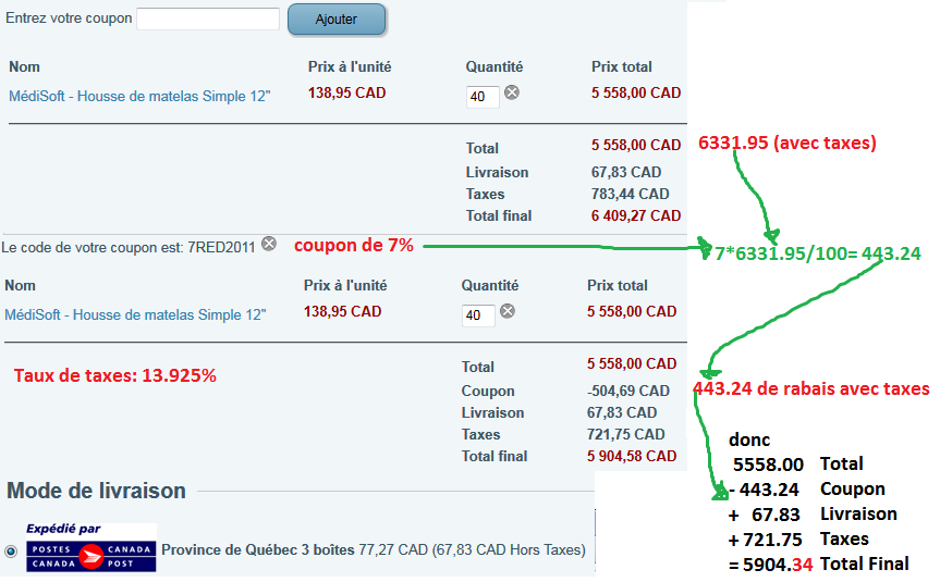 Il doit y avoir moyen d'afficher le coupon sans la taxe ajoutée pour éviter la confusion pour le client. Le client fait la somme de ce qu'il voit à l'écran et doit arriver au grand total.