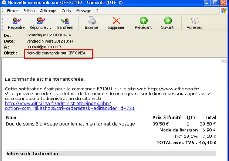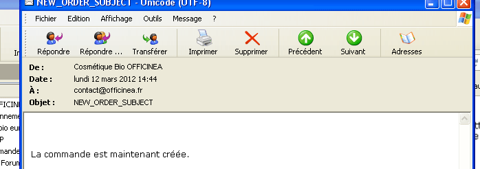 Effectivement, la traduction est bonne mais il y avait un espace dans le sujet de l'email! Par contre, maintenant le sujet du mail est "Nouvelle commande No. B7L7S5 créée sur créée" Avez-vous une autre idée ????
