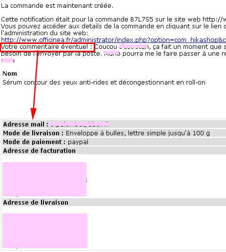 Par contre, je ne parviens pas à mettre en forme le commentaire client (encadré rouge) de la même façon (je ne vois pas bien quelle est la ligne exacte de code qu'il faut que je mette en <td>. Sauriez-vous m'y aider, s'il vous plaît ?