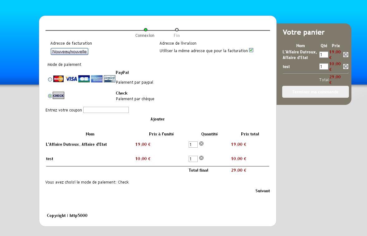 Surement un problème de parametrage. Par exemple, si vous configurez un poid à vos produits, le système considère que le produit n'est pas virtuel et doit être livré. Il demande donc l'adresse de livraison ainsi que la méthode de livraison. Cependant, si le système ne trouve pas de système de livraison, il empèche la finalisation de la commande.