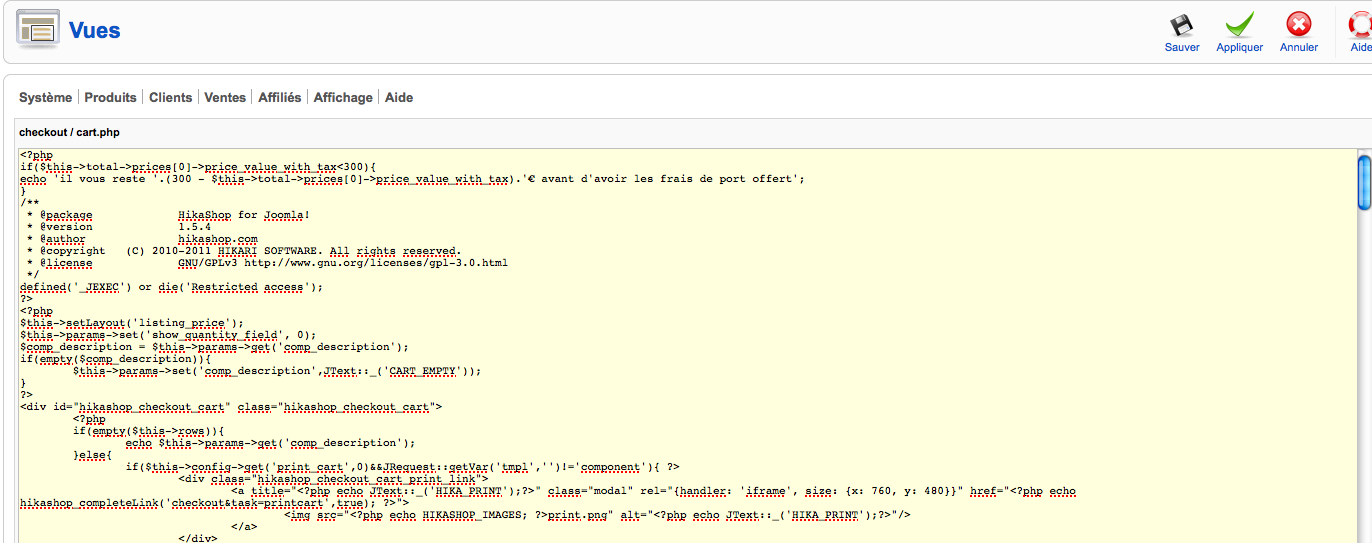 Je travail sur Joomla 1.5.23 et Hikashop Business 1.5.4