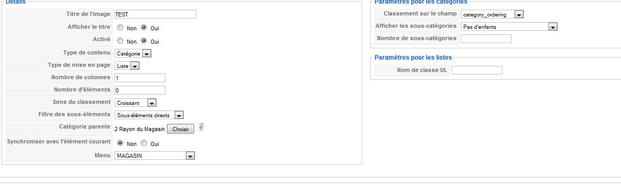Ta réponse m'a permis d'arriver à un mieux, merci, je pense que le résultat espéré n'est plus très loin. J'ai maintenant un seul lien dans mon menu (c'est un menu) qui affiche les catégories dans la partie centrale (voir la capture ci-dessous). Je voudrais afficher les catégories dans le menu (comme à la capture de mon 1er post). Une suggestion? Merci du coup de pouce!