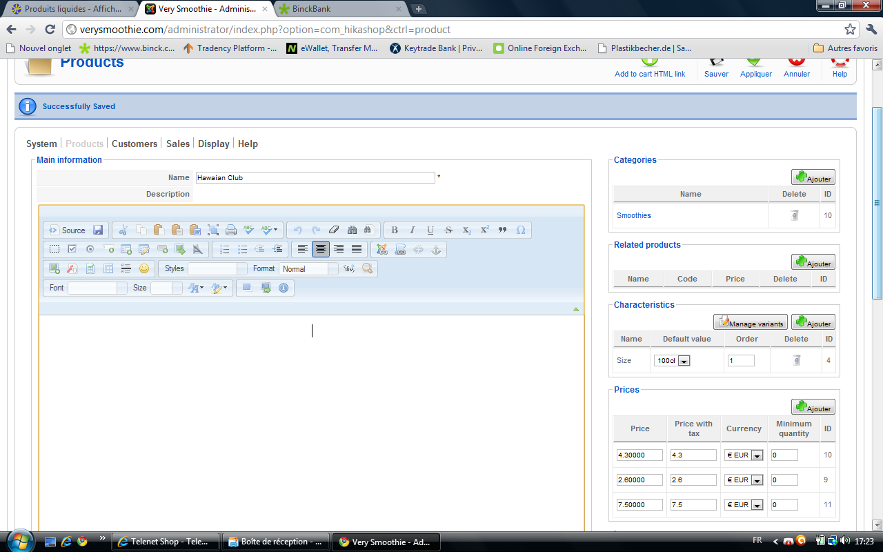 Comme vous pourrez le voir dans l'image, pour le smoothie "hawaian club" j'ai indiqué les 3 prix tvac. J'essaie d'ajouter une caractéristique mais il n'y n a qu'une qui s'enregistre (100cl) pour autant, il n'y a qu'une caractéristique enregistrée "size" avec 3 possibilité 25,50 et 100cl avec les prix respectifs...