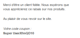 Je ne pense pas qu'il soit un jour techniquement possible de récupérer le code coupon pour l'affichage sur le site vu comment le système est fait.