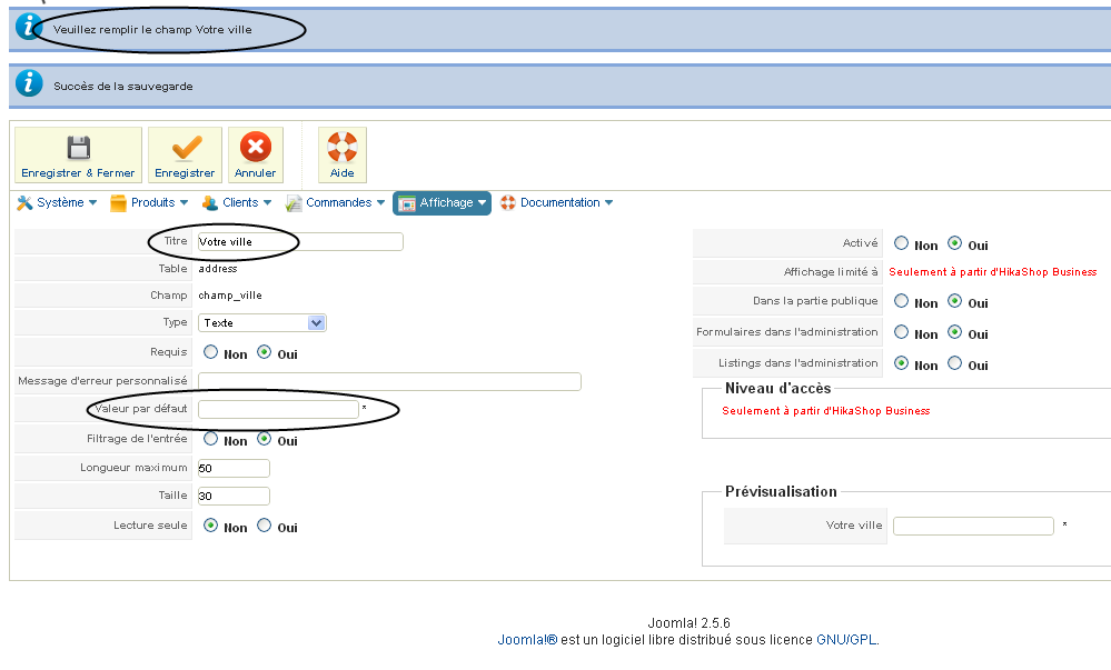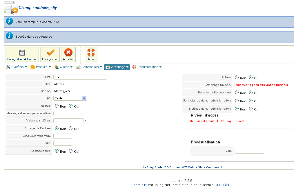 Dans le champs adress_city qui est créé par défaut j'ai un message de condition en haut de la page si je veux enregistrer.