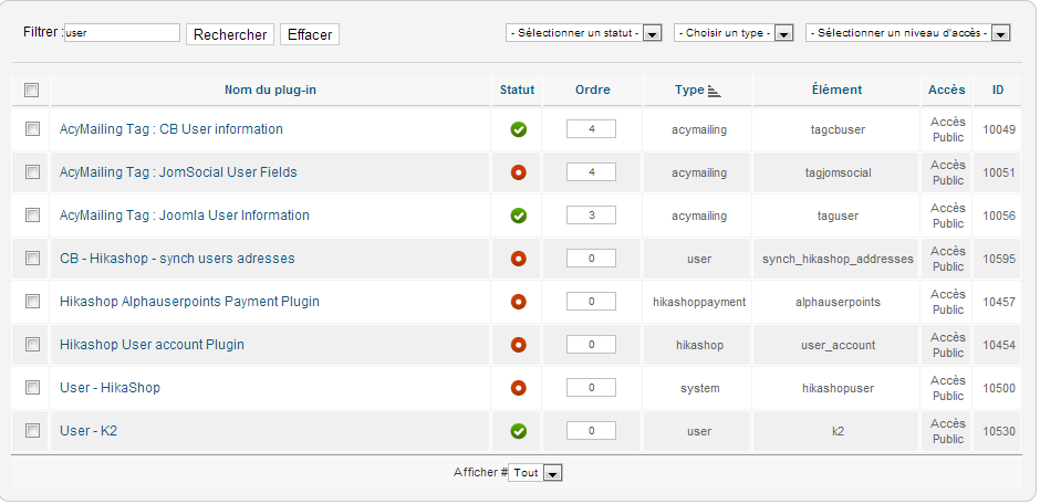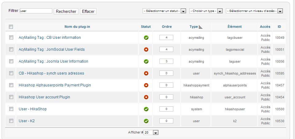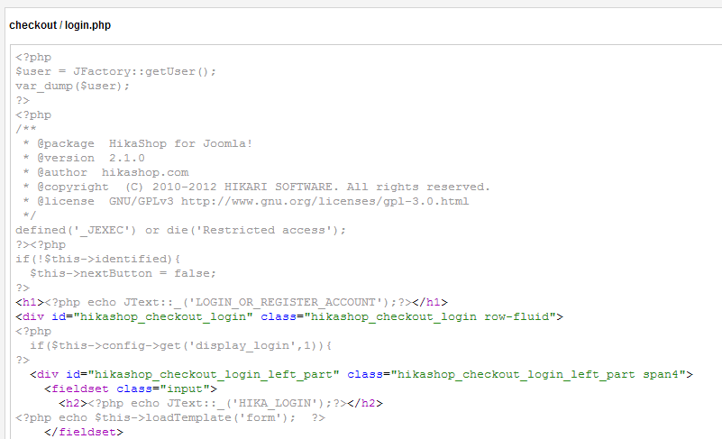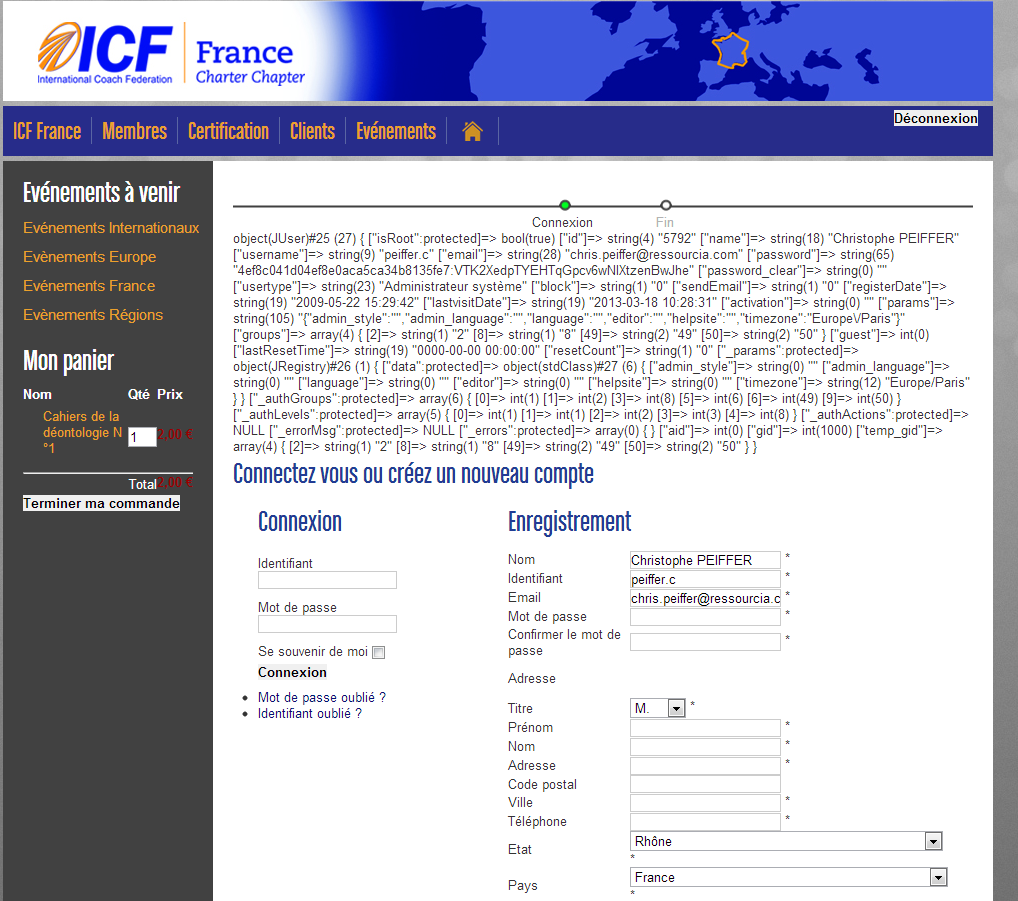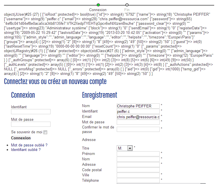 object(JUser)#25 (27) { ["isRoot":protected]=> bool(true) ["id"]=> string(4) "5792" ["name"]=> string(18) "Christophe PEIFFER" ["username"]=> string(9) "peiffer.c" ["email"]=> string(28) "chris.peiffer@ressourcia.com" ["password"]=> string(65) "4ef8c041d04ef8e0aca5ca34b8135fe7:VTK2XedpTYEHTqGpcv6wNIXtzenBwJhe" ["password_clear"]=> string(0) "" ["usertype"]=> string(23) "Administrateur système" ["block"]=> string(1) "0" ["sendEmail"]=> string(1) "0" ["registerDate"]=> string(19) "2009-05-22 15:29:42" ["lastvisitDate"]=> string(19) "2013-03-18 10:28:31" ["activation"]=> string(0) "" ["params"]=> string(105) "{"admin_style":"","admin_language":"","language":"","editor":"","helpsite":"","timezone":"Europe\/Paris"}" ["groups"]=> array(4) { [2]=> string(1) "2" [8]=> string(1) "8" [49]=> string(2) "49" [50]=> string(2) "50" } ["guest"]=> int(0) ["lastResetTime"]=> string(19) "0000-00-00 00:00:00" ["resetCount"]=> string(1) "0" ["_params":protected]=> object(JRegistry)#26 (1) { ["data":protected]=> object(stdClass)#27 (6) { ["admin_style"]=> string(0) "" ["admin_language"]=> string(0) "" ["language"]=> string(0) "" ["editor"]=> string(0) "" ["helpsite"]=> string(0) "" ["timezone"]=> string(12) "Europe/Paris" } } ["_authGroups":protected]=> array(6) { [0]=> int(1) [1]=> int(2) [3]=> int(8) [5]=> int(6) [6]=> int(49) [9]=> int(50) } ["_authLevels":protected]=> array(5) { [0]=> int(1) [1]=> int(1) [2]=> int(2) [3]=> int(3) [4]=> int(8) } ["_authActions":protected]=> NULL ["_errorMsg":protected]=> NULL ["_errors":protected]=> array(0) { } ["aid"]=> int(0) ["gid"]=> int(1000) ["temp_gid"]=> array(4) { [2]=> string(1) "2" [8]=> string(1) "8" [49]=> string(2) "49" [50]=> string(2) "50" } }Xavier wrote: Avez vous essayé d'afficher la page avec un utilisateur enregistré ?