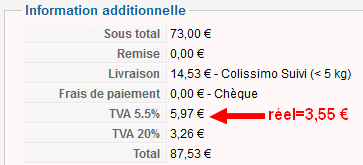 Concrètement sur la capture ci-dessus, je ne parviens pas à remettre le taux de TVA de la livraison à 20% (et donc le montant de TVA de la livraison vient s'ajouter au montant de la TVA à 5,5% sur la facture...) : lorsque j'enregistre cela se remet à 5,5% (alors que, je le rappelle, tout était correct à la commande initiale).